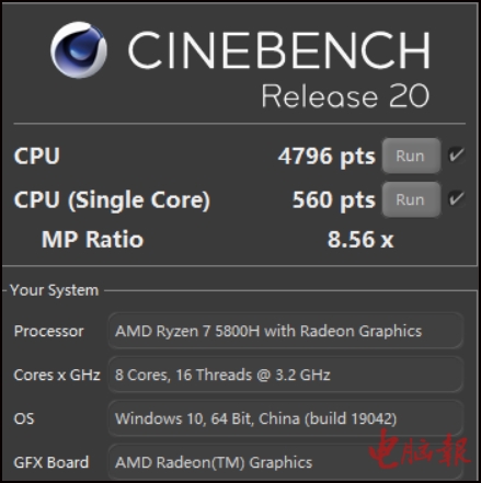 ▲Cinebench R20测试,暗影骑士·龙的锐龙7 5800H多核得分为4796pts,单核为560pts。同样作为参考,锐龙7 4800H多核为4256pts,单核为484pts。这项测试时间更长一些,多核提升幅度为12%,单核为15%。