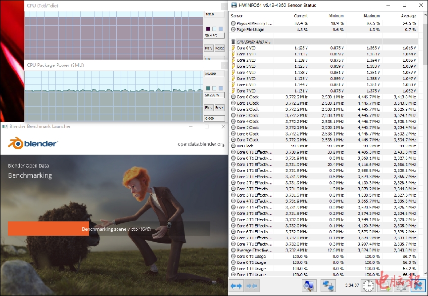 ▲重度负载测试Blender Benchmark六个场景连续渲染,软件版本选择为2.91.2。该项测试即便是对于8核处理器来说也需要四五十分钟,足以考察处理器满载时的运行情况。最终暗影骑士·龙渲染用时如上图所示。
