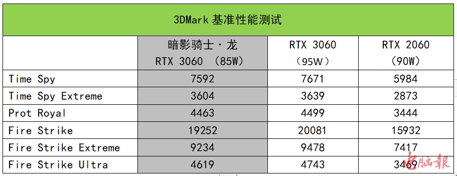 3DMark基准测试中,85W款的GeForceRTX3060相比上一代90W款RTX2060独显,性能增长提升幅度约在20~33%之间,高分辨率下优势会更明显一些,光追性能相比上一代提升幅度达到了29%。同时,在基准测试中,相对于95W款的RTX3060,暗影骑士·龙搭载的85W款基准测试与其基本处于同一水平,仅FireStrike一项有约5%的差距。
