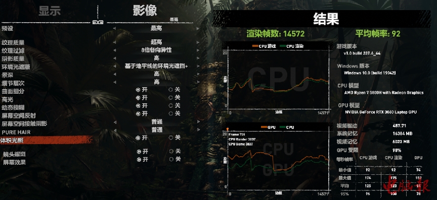 ▲《古墓丽影:暗影》FHD最高画质平均帧速为92fps, 95W款的RTX 3060则是94fps——只差两帧。