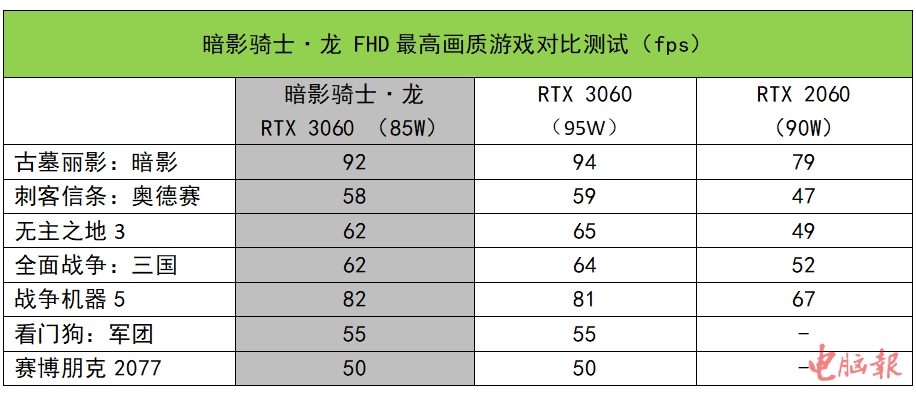 其次,相对于95W的RTX 3060,综合所有测试来看,在FHD下面基本可以算作是同一级别的独显。部分游戏中95W款RTX 3060略胜几帧,部分游戏中打平,还有1款游戏略输暗影骑士·龙1帧。