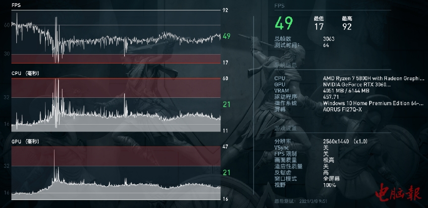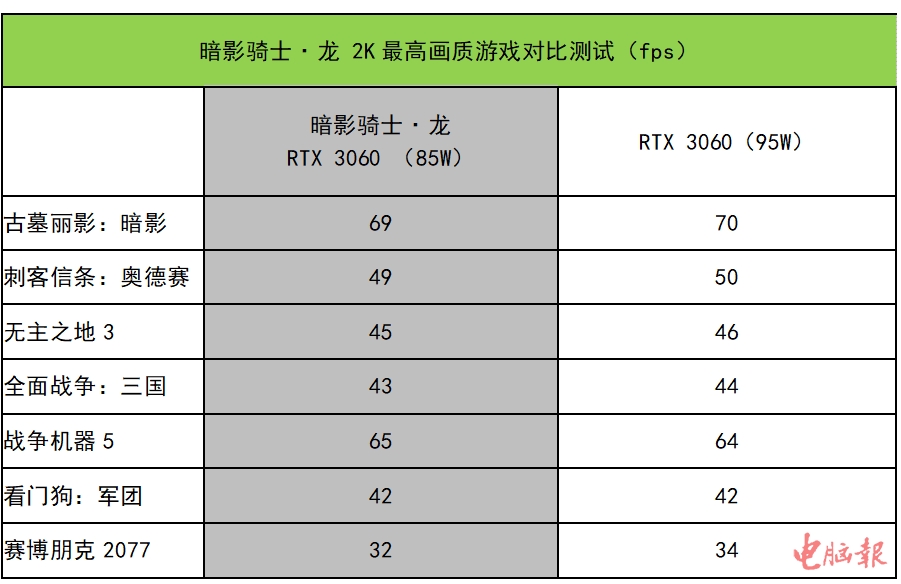 接下来再看看暗影骑士·龙在2K分辨率下的游戏表现,由于该机自带的是FHD 144Hz屏幕,因此2K游戏测试为外接显示器,测试项目为3A大作,并同样加入95W款的RTX 3060作为对比。