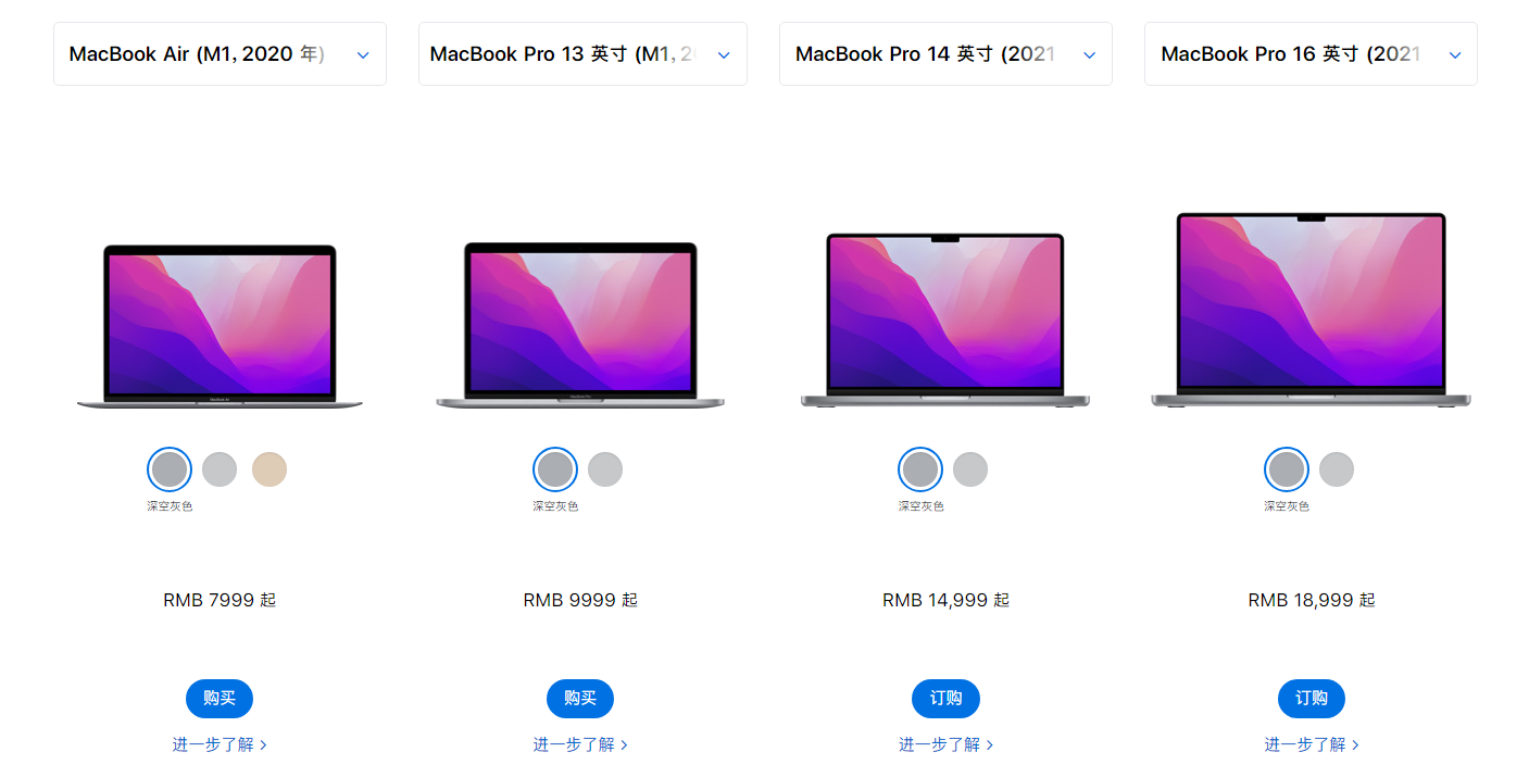 其中,去年的两款都是搭载的M1芯片,今年的新款则可以根据需求自行选配M1 Pro和M1 Max,售价自然是越强越高:MacBook Air起售价7999元,13英寸MacBook Pro起售价9999元,14英寸MacBook Pro起售价14999元,16英寸MacBook Pro起售价18999元。