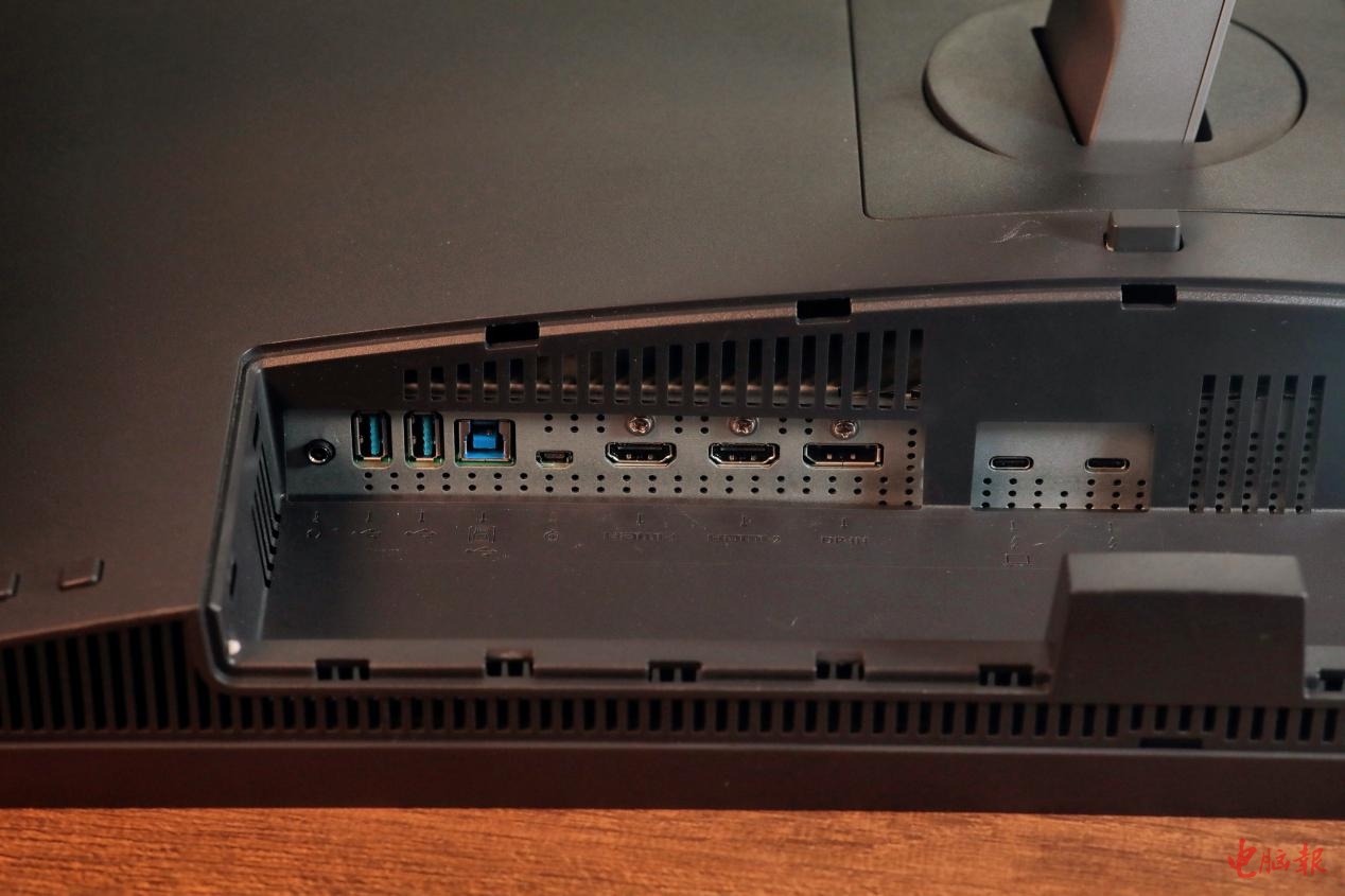 另外明基PD2725U在背面提供了2个雷电3接口,其中1个为可以输出65W功率,速度可以达到40Gbps,可传输音频、视频、电力,方便MacBook用户连接;另一个为15W的雷电3接口,支持雷电3菊花链,可以同时传输电力与音频,方便MacBook用户拓展多屏。这意味着使用供电、传输图像信号一条雷电3线就够了,不用转接线或扩展坞,对画面没有影响。上班的时候,就不用随身背着电源适配器了增加重量了,也让桌面变得更为清爽。
