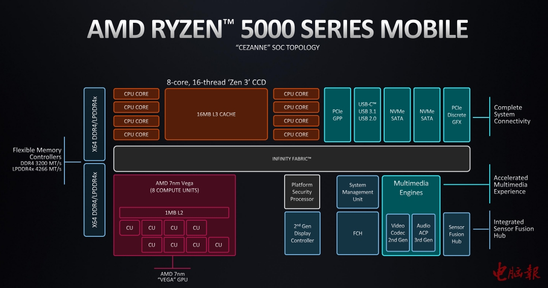 作为7nm ZEN3架构的先头部队,锐龙5000系列台式机处理器率先登场,经过全新设计的单CCX 8核心共享三级缓存的ZEN3架构表现出了极高的执行效率,IPC大增19%,游戏性能方面更是大幅反超同期竞品,同时7nm工艺也带来了更高的能效比,这让锐龙5000系列在功耗控制方面也领先了竞品几乎两代的水平。如此优秀的高效架构,AMD当然会应用到移动平台上来,于是,在今年的CES发布会上,代号塞尚的锐龙5000系列移动处理器就正式登场了。