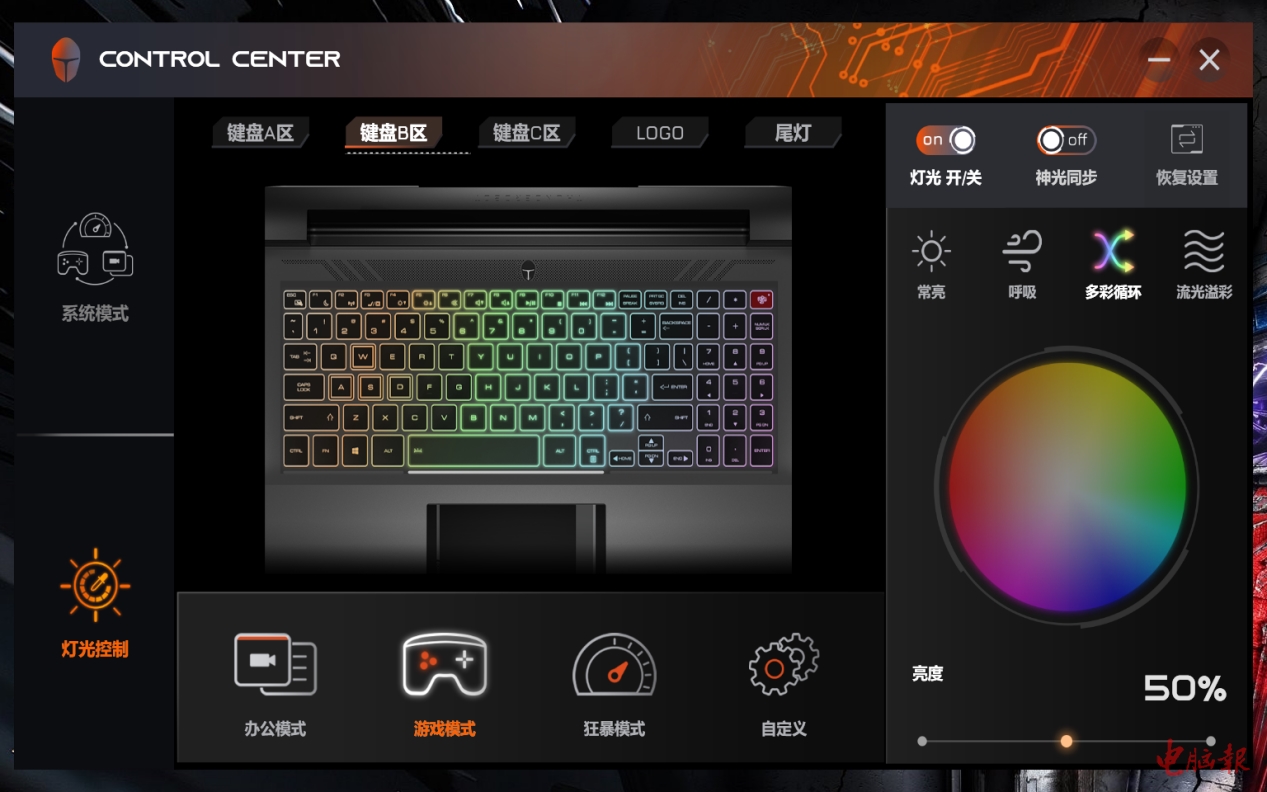 雷神ZERO的灯效也是一大卖点,并且涵盖的部件极多:包括键盘面、A面LOGO、尾部左右出风口灯环等地区,且支持各种灯效(呼吸、常亮、循环等)和神光联动,尤其是A面LOGO和出风口的灯环两处,非常引人瞩目,也进一步提升了机身的档次感。