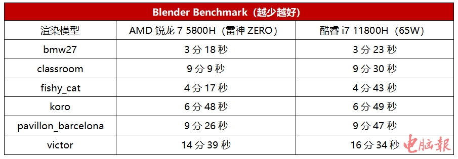 从以上满载渲染测试来看,65W的AMD锐龙7 5800H在满载状态下的确效率比65W的酷睿i7 11800H要高,全部测试项目均领先,毕竟锐龙5000H系列有着7nm先进工艺的优势,能效比更胜一筹也是显而易见的。
