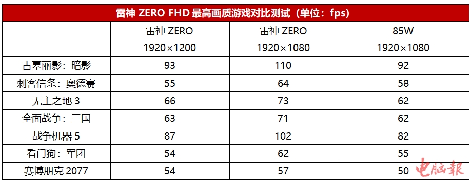 测试来看,在同为1920×1080分辨率下,雷神ZERO搭载的130W款RTX 3060相比85W款有比较明显的提升,全部游戏的领先幅度都达到了10%以上,《古墓丽影:暗影》提升幅度达到了19%左右,《战争机器5》则达到了24%。当然,这其中有一定的直联外接显示器因素。而在原生屏16:10比例的1920×1200分辨率下,雷神ZERO的帧速还不错,都能以最高画质流畅运行测试的3A大作,即便是优化很差的《赛博朋克2077》也有54fps的平均帧速。