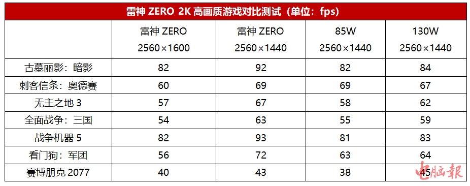 接下来我们将游戏测试提高到2K分辨率级别。同样的,我们也针对雷神ZERO做了2560×1600分辨率内屏测试和2560×1440分辨率外接显示器测试。游戏设置为预设高画质,并加入了85W款RTX 3060(处理器同为AMD锐龙7 5800H)+外接显示器2560×1440分辨率测试分数、130W款RTX 3060(处理器为AMD锐龙7 4800H)+原生2560×1440分辨率测试分数作为参考对比。