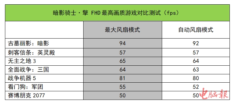 由此我们可以推测,在自动风扇模式和最大风扇模式下,暗影骑士·擎的游戏表现应该十分接近。也就是说,大家实际游戏时,无需开启最大风扇模式。下面我们看看两种风扇模式下的游戏基准测试有没有差异。