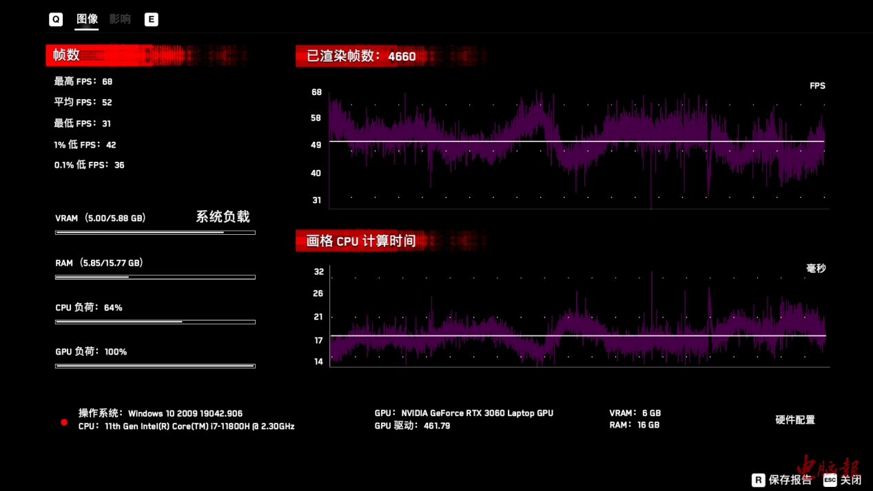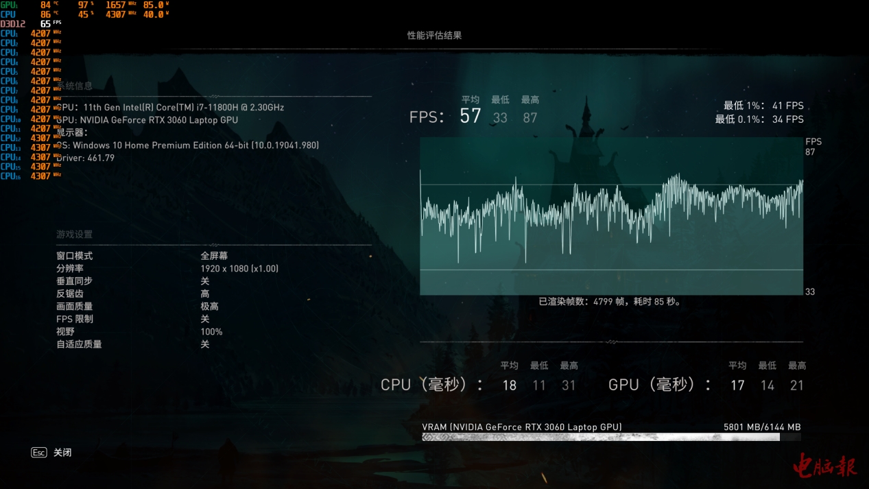 ▲实际上,对于这类帧速较低的游戏,可开启游戏中的DLSS选项来提升性能表现。上图在是2K预设高画质下,开启DLSS平衡时的情况。i7 11800H和RTX 3060的功率/温度基本保持不变,但是开始DLSS之后,游戏平均帧速达到了63fps,直接从不算流畅级别升级到了流畅级别,效果非常明显。
