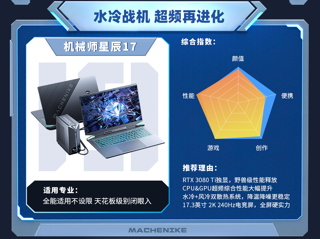 大学里需要用到电脑的专业非常多,这款被玩家用户人群称为性能天花板的机械师星辰17电竞本,搭载第12代英特尔酷睿i9-12900H处理器,英伟达RTX 3080 Ti显卡,支持超频模式,一经开启处理器综合性能可提升8%,持续刷新使用体验。配备水冷加风冷双散热系统,充分释放强劲性能,轻松征服专业课程应用需求,报考各大专业的学子都可以闭眼入!