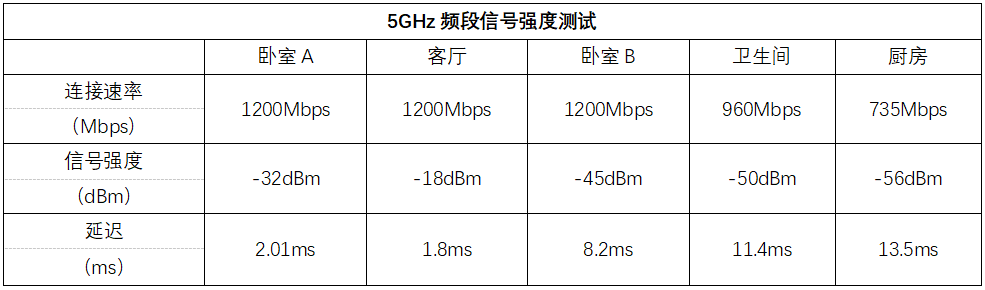 华硕天选游戏路由器5GHz频段的室内覆盖表现十分出色,在客厅、卧室A和卧室B三个主要的活动空间内,都可以达到该款手机的最大连接速率1200Mbps,信号相对较差的卫生间和厨房也能保证735Mbps以上的连接速率,平均信号强度在-40dBm以上,在家里的任何位置都能跑满500Mbps宽带。无线连接时的延迟表现比较不错,观看高清视频和手游时的网络稳定性很高。