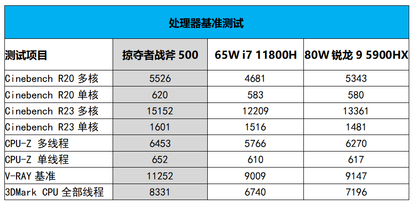 从基准测试来看,掠夺者战斧500的测试数据非常惊人,相比65W的i7 11800H以及80W的锐龙9 5900HX,在基准测试上具有明显优势!比如在大家熟悉的Cinebench系列测试中,掠夺者战斧500的R20和R23多核成绩分别为5526、15152,领先80W锐龙9 5900HX的5343、13361,100W的i9 11980HK性能相当炸裂!