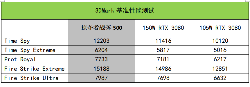 从3DMark的基准测试结果来看,掠夺者战斧500搭载的满功耗版RTX 3080在Time Spy测试项目中显卡分数为12203,相比105W款的RTX 3080领先幅度达到了19.5%,相比150W款RTX 3080则有6.8%的提升。而在Fire Strike Extreme测试项目中,掠夺者战斧500显卡分数达到了15188,相比105W款RTX 3080提升幅度为18.1%。