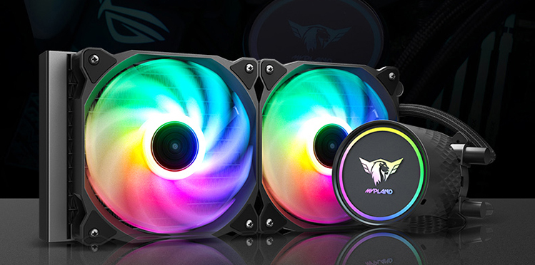 在颜值方面,航嘉MVP海神X240表现也不错。水冷头柱面为美观的“高尔夫球”式鳞次栉比的曲面纹理,水冷头顶部亚克力镜面+RGB灯的设计效果非常抢眼,可以同步点亮,也支持和主板等其他设备联动的2个ARGB风扇也能增加整个主机的炫酷感。