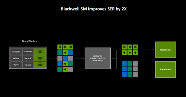 Blackwell的SM单元经过了全新的设计,整个架构完全为新的神经网络渲染而打造。从图中可以看到,和上代针对常规渲染设计的Ada SM相比,Blackwell SM将支持INT32的着色器单元数量增加了一倍(INT32/FP32着色器单元总数不变), 同时将着色器执行排序的效率提升到上代的两倍(对常规渲染和神经网络渲染的代码进行排序)。