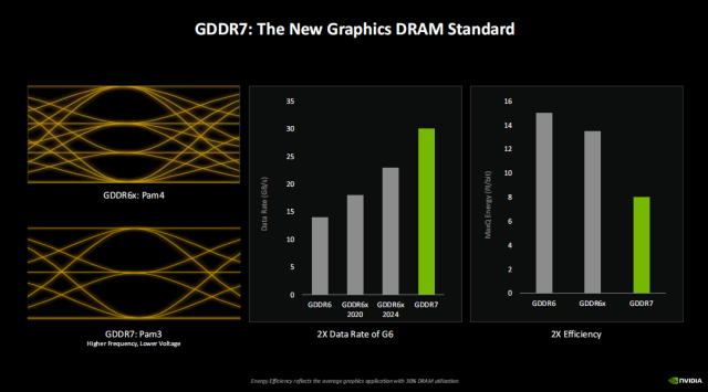Blackwell是第一款搭载GDDR7显存的GPU,相对GDDR6显存来讲,GDDR7提供了两倍的数据传输速率,同时由于GDDR7使用了PAM3的模式,拥有比GDDR6X PAM4模式更低的工作电压,所以不但速率更高,功耗也更低,相对GDDR6更是提升了一倍的能效。