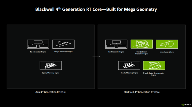 Blackwell架构的一项重大技术升级就是支持Mega Geometry,可将场景中的光线追踪三角形数量至多增加 100 倍,从而可以在游戏或者3D应用中提供超高的几何细节,打造极为逼真的模型。而实现Mega Geometry的硬件基础当然就是Blackwell搭载的第四代RT Core,它相对上代Ada架构的第三代RT Core增加了三角形集群的交汇引擎、三角形集群解压缩引擎与线性图形扫描单元(专用于加速毛发渲染)