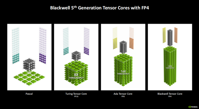 Blackwell另一大亮点就是其搭载的第五代Tensor Core支持FP4精度的计算,如果和Pascal架构相比,它的算力提升了31倍,相对上代Ada的Tensor Core(FP8),也提升了一倍。为什么要选择FP4模式?按照NVIDIA官方说法,FP4模式在可以满足渲染精度的同时下能够提供更快的渲染速度,综合来看是当下最符合需求的平衡点。