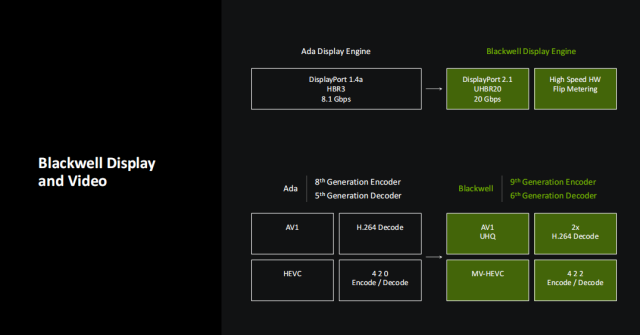 显示与视频部分,Blackwell也带来了一系列的升级,输出部分,它支持DP2.1接口,支持UHB R20,拥有20Gbps的带宽。而在视频编解码部分,它的编码器从Ada的第八代升级到了第九代,解码器也从Ada的第五代升级到了第六代。因此,Blackwell现在支持AV1 UHQ、双倍的H.264解码,MV-HEVC,同时也支持4:2:2格式的硬件编解码了,对于视频剪辑师用户来讲非常实用。
