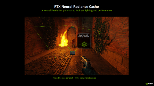 RTX神经网络辐射缓存方面,用于路径追踪间接光照和性能的神经网络着色器支持实时自我训练网络,通过每像素一次弹射可推算出更多的弹射,大幅节约资源,提升效率。