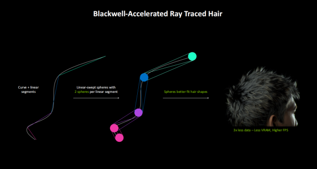 我们知道,在游戏中用传统的方式来精准渲染发束会用到非常多的三角形,一个角色的头发甚至要用到六百万个三角形。而Blackwell通过线性扫描球体这个新加入的渲染单元,则可以大幅降低发束对三角形数量的需求,相对传统渲染方式来讲,仅需1/3的数据开销,因此可以提供更高的帧率。