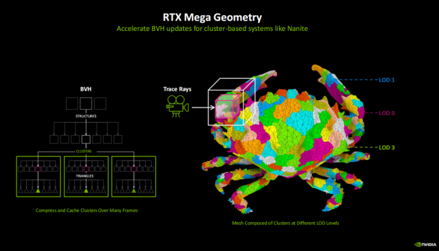 传统的几何体系统中每一个场景LOD的BVH(包裹体变异)都需要去更新,因此资源开销会非常大,而适用于数百万三角形的集群系统(Cluster)引入,让构建这个系统的成本大幅降低。Mega Geometry则可以在多帧上来压缩和缓存这些集群,从而加快场景更新LOD的BVH的速度,提供对数百万几何体数量高精度模型实现路径追踪的能力。