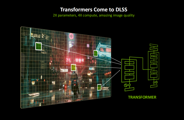 而RTX 50系核心灵魂所在的新一代的DLSS 4则使用了新的Transformer模型,相对之前的CNN卷积神经网络模型来讲,提供了两倍的参数、四倍的计算以及更加出色的画质。