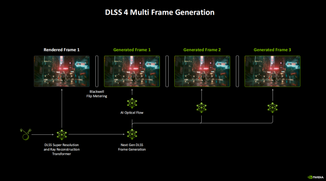 不过,这次DLSS 4最令人兴奋的大招当然是全新的多帧生成技术。我们知道,之前DLSS 3的帧生成技术是AI模型使用游戏本身的数据(运动矢量和深度),通过光流场加速器来生成新的帧,但每帧只能生成一帧,毕竟通过这种方式要生成多帧会导致极高的资源开销。而Blackwell架构则针对DLSS 4的多帧生成设计,包括增强的Tensor Core、增强的Flip Metering和AMP。在此基础上,DLSS 4的多帧生成采用的模型速度提升了40%,使用的显存减少了30%,而且只需要渲染一次就可以生成全部的三帧,生成的帧会均匀排列,从而提供流畅的体验。