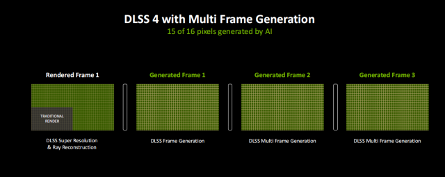 从图中可以看到,DLSS 4和多帧生成技术加持的情况下实际渲染的16个像素中,就有15个是AI生成的。综合计算下来,可以让帧率最高提升八倍。