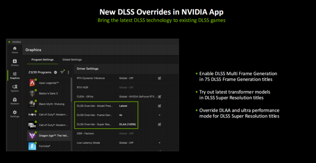 首发支持DLSS 4的游戏与应用有75款,那么对于暂时不支持DLSS 4的游戏来讲,大家也可以在NVIDIA app中使用DLSS Override功能来提前享受DLSS 4。例如《漫威争锋》就可以通过DLSS Override来提前享受多帧生成带来的巨幅帧率提升。