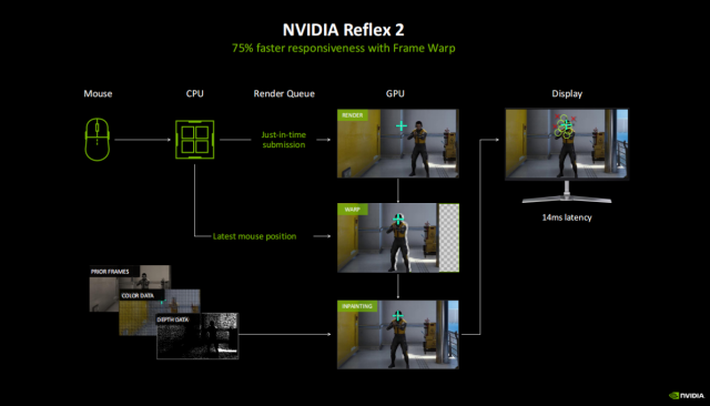 可能玩家会担心多帧生成会带来更多的延迟,不过NVIDIA的Reflex2显然会让大家打消这个顾虑。NVIDIA在Reflex 2中部署了一个以前应用在VR中的技术(Frame Warp),在每一帧渲染结束之后,Reflex 2都会移动画面对齐最新的鼠标位置。不过,Frame Warp会在画面中产生空白的区域,为此NVIDIA开发了一项Inpaint预测修补技术,这个技术使用前一帧的颜色与深度数据对空白区域进行修复,从而创造出与原生渲染几乎没差别的画面。