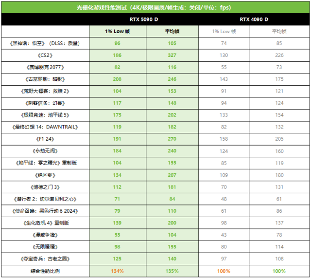 接下来看看4K极限画质设定下光栅化游戏性能的表现。从测试情况来看,RTX 5090 D相对RTX 4090 D的平均帧率提升幅度从24%到59%不等,平均提升幅度大约为35%,其中《赛博朋克2077》《永劫无间》提升幅度都非常抢眼,分别达到了59%和50%之高。而在考查游戏流畅度的1% Low帧方面,RTX 5090 D的表现也非常出色,在《博德之门3》中甚至领先了60%,综合全部游戏平均领先幅度是34%。