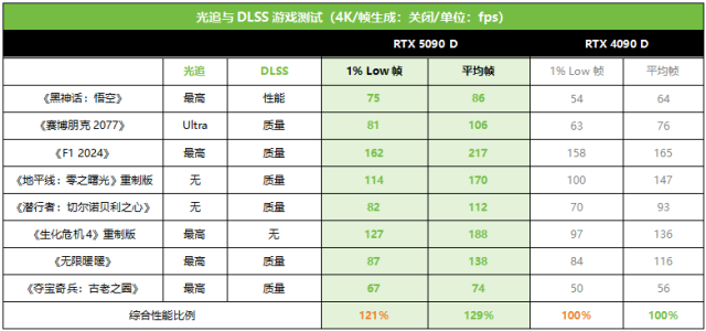 在打开光追和DLSS(CNN模型)的主流3A游戏中,RTX 5090 D相对RTX 4090 D的平均帧优势从16%~39%不等,平均领先幅度大约为29%。而1% Low帧部分,RTX 5090 D相对RTX 4090 D的领先幅度最高也达到了39%,平均领先21%。所以无论是绝对帧率还是游戏平滑度,RTX 5090 D都是大幅超越上代RTX 4090 D的存在。