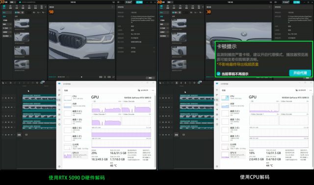 RTX 5090 D在视频解码方面同样十分强大,它配备的两个第六代解码器在剪映中可以同时流畅解码5条H.265/4:2:2/10bit视频不掉帧。但如果用CPU来解码,就算是拥有16核32线程的锐龙9 9950X,来完成同样的解码工作也会出现严重卡顿,无法流畅预览。可见对于视频剪辑师来说,RTX 5090 D新一代的编解码器确实会带来更高的工作效率。