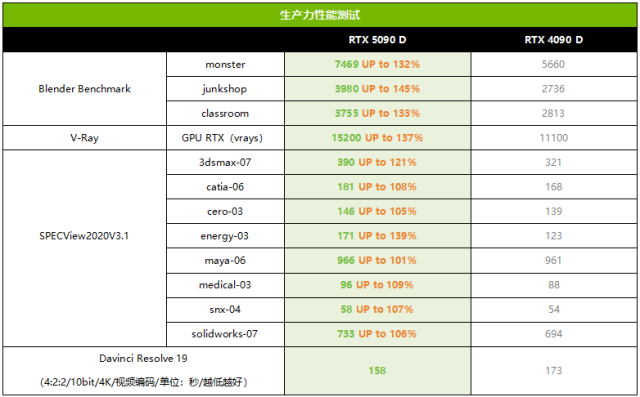 RTX 5090 D提供了更多的CUDA单元和更为强大的32GB/512bit/GDDR7显存,因此在各种3D设计工具软件中也会提供更高的执行效率。从测试结果来看,RTX 5090 D在Blender中相对RTX 4090 D有32%~45%的提升;在V-Ray GPU RTX渲染中有37%的提升;在SPECView2020V3.1中的平均提升幅度则为12%。由此可见,对于经常要用到3D设计工具的用户来讲,RTX 5090 D相对上代提升巨大,是更加高效的升级选择。此外,RTX 5090 D新增了对4:2:2/10bit格式视频编解码的支持,我们使用Davinci Resolve 19 + Voukoder进行了编码测试对比,确实有明显的提升。