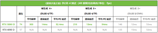 从测试结果来看,在DLSS 4模式下,启用4×、3×和2×帧生成,RTX 5090 D的帧率相对原生分别提升了746%、571%和、377%,提升幅度可以说是非常夸张了。同时,我们也可以看到,使用Transformer模型实现2×帧生成,相对DLSS 3的CNN模型也有7%的帧率提升,可见新模型的使用确实也进一步提升了DLSS 4的性能。