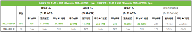 《漫威争锋》暂时没有原生支持DLSS 4,不过可以在NVIDIA APP中使用Override模式来开启DLSS 4和多帧生成。可以看到,在 4×/3×帧生成模式下,RTX 5090 D的帧率相对于原生分别提升了289%和217%,而同样使用2×帧生成模式,使用Transformer模型相对CNN模型也提升了6%。而RTX 5090 D采用4×帧生成的帧率相对采用DLSS 3 + 2×帧生成的RTX 4090 D则提升了137%,和原生比更是提升了419%。延迟部分,可以看到RTX 5090 D在几种帧生成比例下的渲染延迟与PC延迟差别都很小,所以对于玩家来讲直接启用DLSS 4的4×帧生成无疑是获得高帧率和流畅操作的最佳选择。