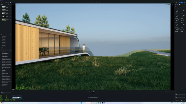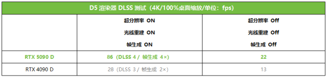 除了游戏之外,DLSS 4在3D渲染类生产力软件中也能大显神通,目前D5渲染器也可以通过Override模式来支持DLSS 4和多帧生成,从而提供更流畅、更高效的使用体验。从测试来看,开启DLSS 4和4×帧生成,RTX 5090 D的帧率相比原生(关闭超分辨率、光线重建和帧生成)提升了291%,比仅有DLSS 3和2×帧生成的RTX 4090 D提升了207%,比它的原生帧率提升了561%。可以说这个提升幅度达到了惊人的水平,对于设计师用户来说堪称史诗级的体验升级。
