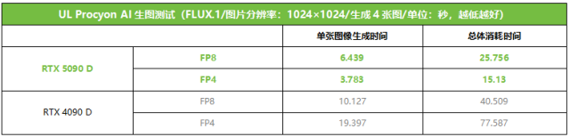 ▲RTX 5090 D在UL Procyon的AI出图测试中使用FLUX.1模型/FP4精度设置,出图速度相对FP8精度提升约70%
