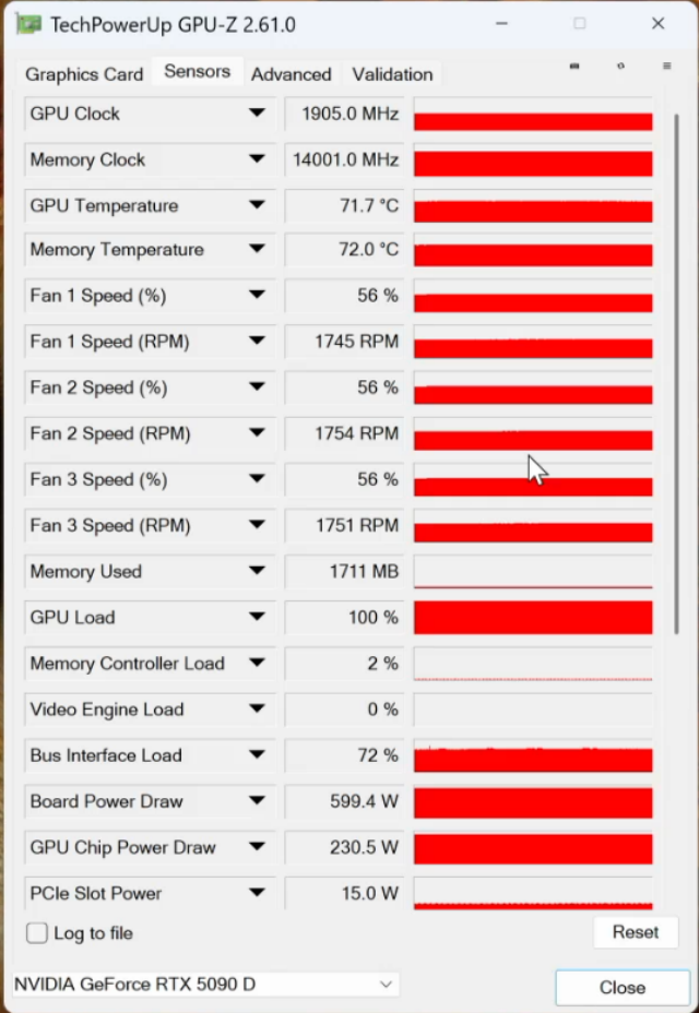 ▲RTX 5090 D超级雕(白)满载考机整板功率600W,GPU温度不到72℃,风扇噪声小,散热效果出色