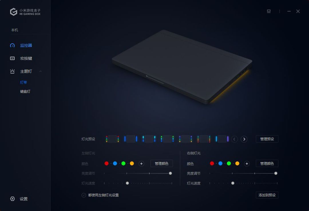 小米游戏本充分体现了小米最擅长细节设计的特点,首先它的背光系统就很有诚意,键盘有分4区可独立调整1680万色RGB,并有多种跑马效果可选,当然可能不算什么很独特的,但它却是为数不多采用氛围灯设计的笔记本。大多数有背光灯带设计的游戏本都会直勾勾地把灯带呈现于玩家眼前,但小米换了个思路,它左右两侧的灯带是朝下设计,氛围灯的效果是直接打在桌面上,弱光环境下一般灯带的刺眼等问题一口气就得到了解决,也顺便让它的气质提升了一个档次。