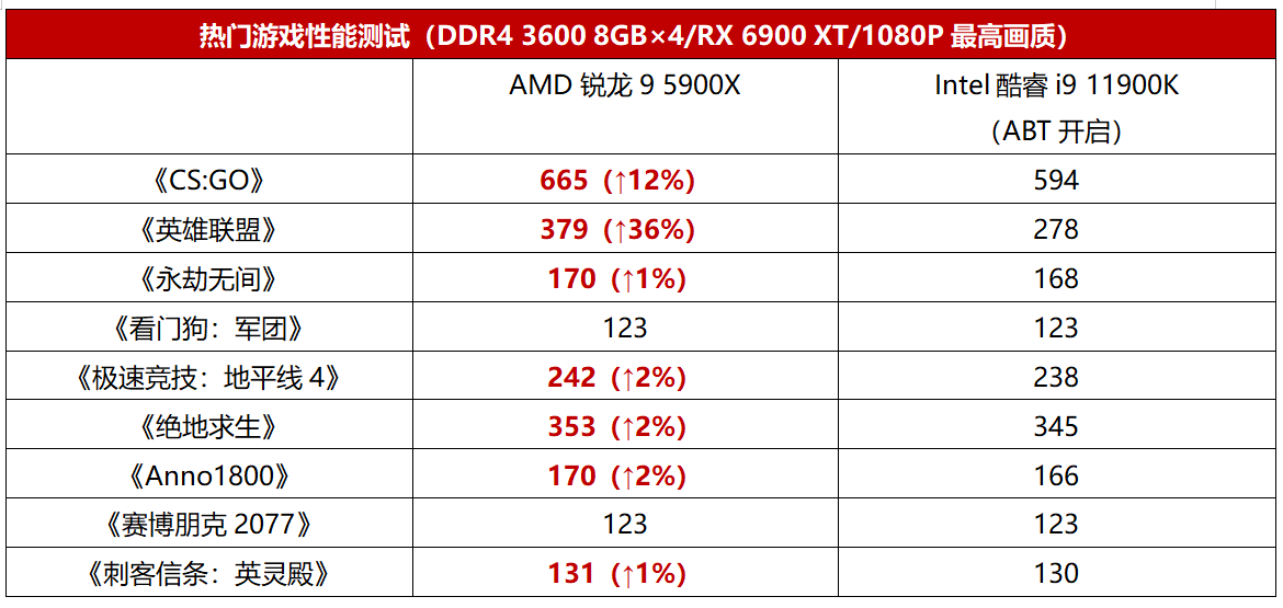 相信大家已经看过很多有关ZEN3架构的游戏性能测试了,在《CS:GO》《英雄联盟》这样的热门电竞网游中,采用ZEN3架构的锐龙拥有无可比拟的性能优势。从表中可以看到,AMD锐龙9 5900X在这两款电竞网游中相对Intel酷睿i9 11900K的帧率优势达12%~36%之多,几乎高出一代到两代的水平,而在热门3A游戏大作中(包括目前人气爆火的《永劫无间》),AMD锐龙9 5900X也能提供与Intel酷睿i9 11900K相当或者高出1%~2%的帧率,综合来看游戏性能是强于Intel酷睿i9 11900K的。