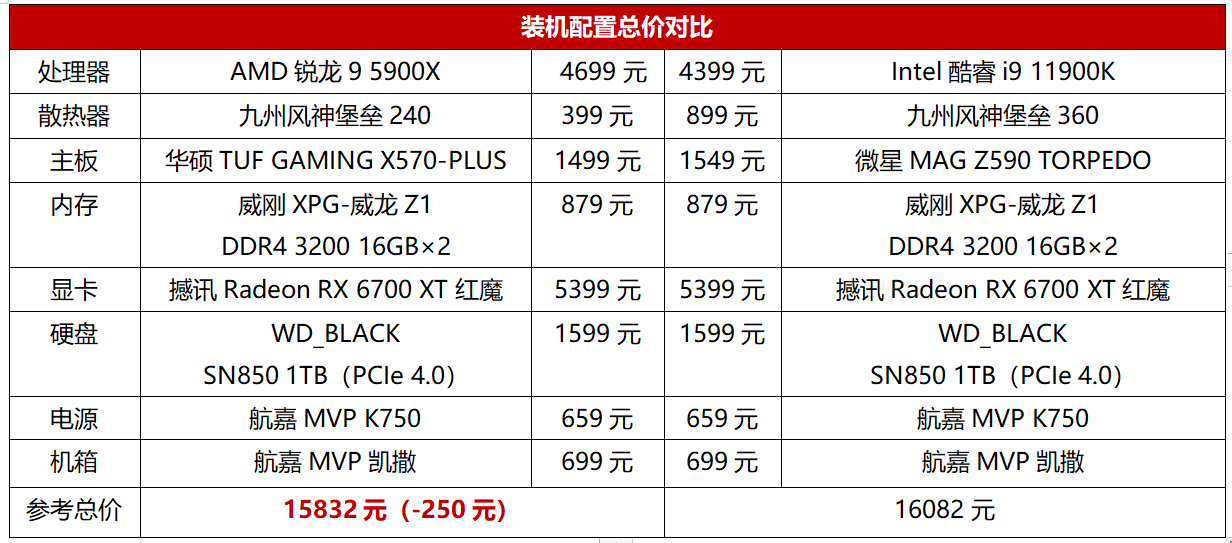 而实际装机方面,我们可以看到在相近的预算下,由于AMD锐龙9 5900X的TDP更低,搭配240水冷即可正常使用,而火力全开的Intel酷睿i9 11900K需要使用价格更高的360水冷才能基本压制住高温,从而让装机成本进一步提高。此外,AMD平台的X570主板相对来说也比同级Z590更有价格优势,因此AMD锐龙9 5900X整机相比之下性价比更加突出了。