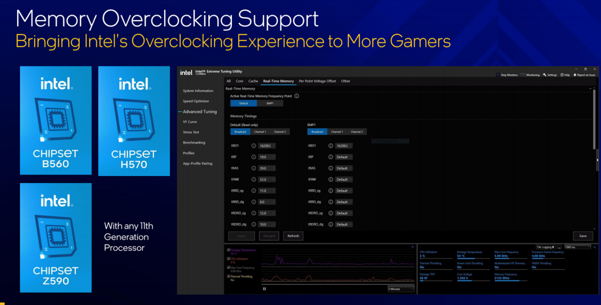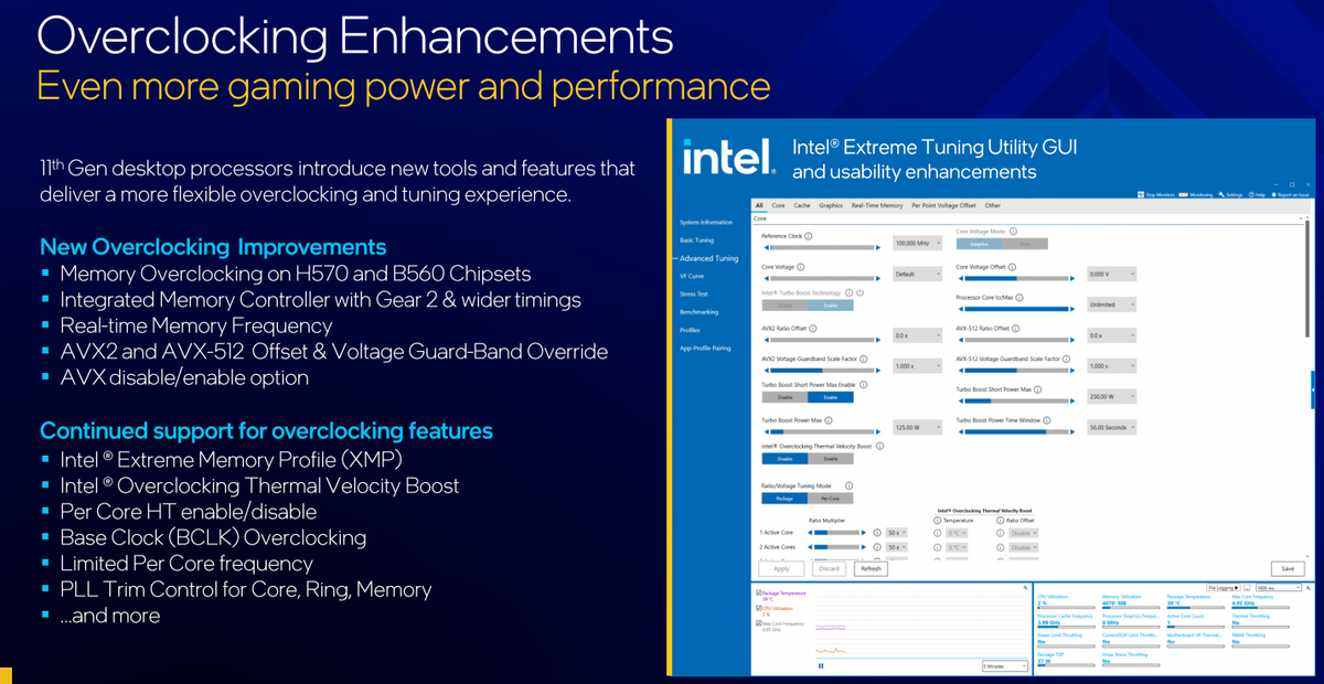超频一直都是Intel玩家比较钟爱的操作,每一代酷睿处理器在超频功能方面都有所改进和提升。第十一代酷睿则支持开关AVX功能,以帮助玩家获得更好的频率提升。同时还有AVX2/AVX512 offset与Voltage Guard-Band Override,超频玩家可以进一步细调压榨处理器性能极限。同时,在上代的基础上,第十一代酷睿还支持单独开关单核核心的超线程功能、对每个核心进行单独的电压/频率的微调等,玩家可以操作的空间更大,对于熟悉超频的玩家来说,可以籍此获得更好的超频成绩。