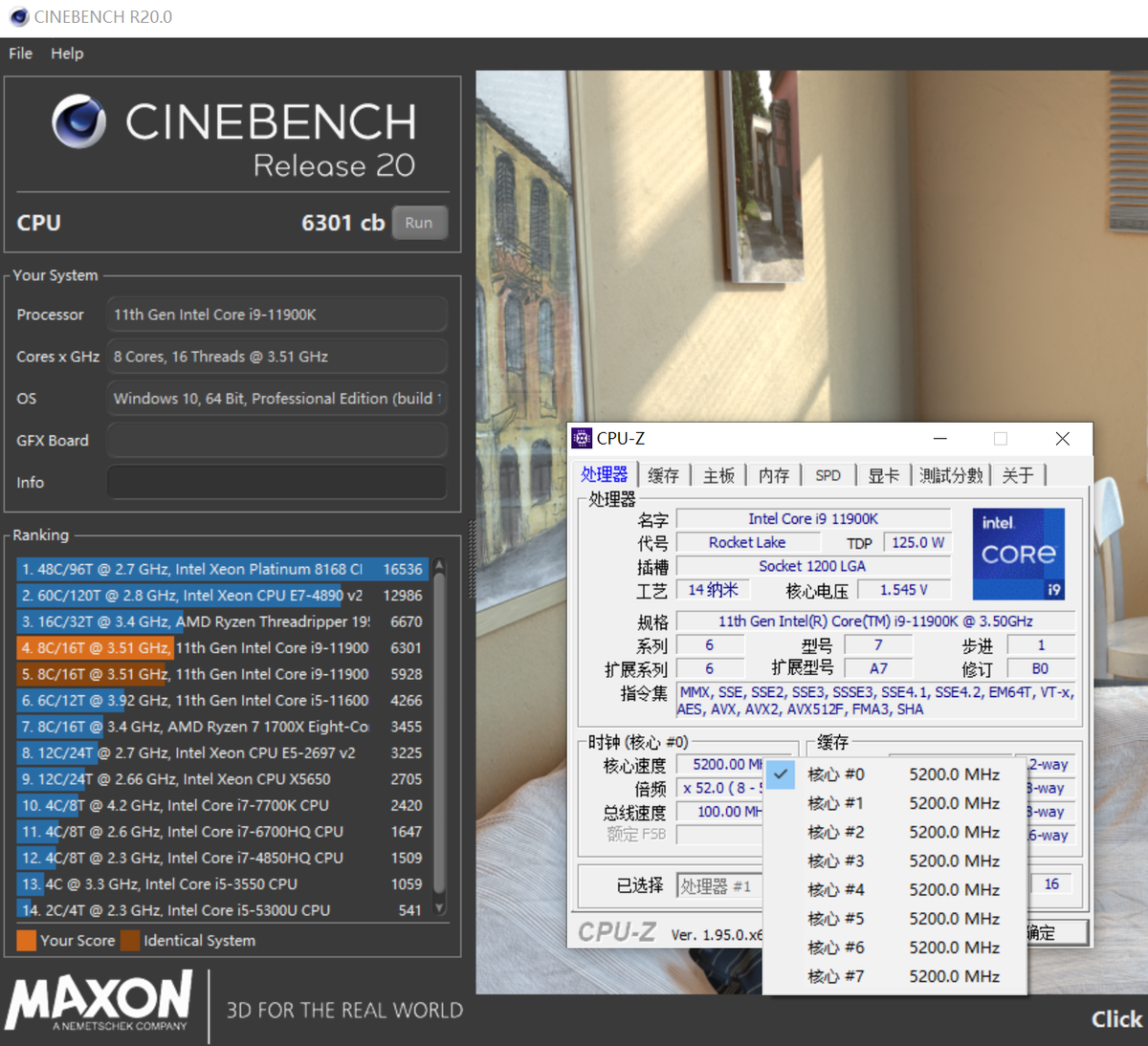 我们将手中的这颗酷睿i9 11900K设定在了全核心5.2GHz,通过了考机和跑分测试,此时的Cinebench R20多核得分已经超过了6300分,但功耗也超过了300W,温度更是在100℃左右徘徊,很显然,散热条件已经不允许我们进行更高频率的尝试。如果想要进一步提升频率,则需要用到半导体制冷或压缩机制冷这样的更为强劲的主动散热了。