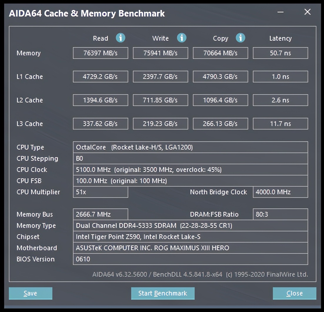 金士顿HyperX 掠食者系列骇客神条DDR4 4800 8GB×2也是海力士颗粒,在XMP下的默认时序为19-26-26-46@1.5V。经过简单的调试,我们将其超频至了5333MHz@22-28-28-55,AIDA64的读写测试成绩为76000MB/s左右,延迟则为50.7ns。