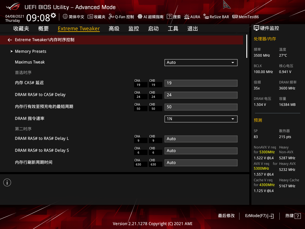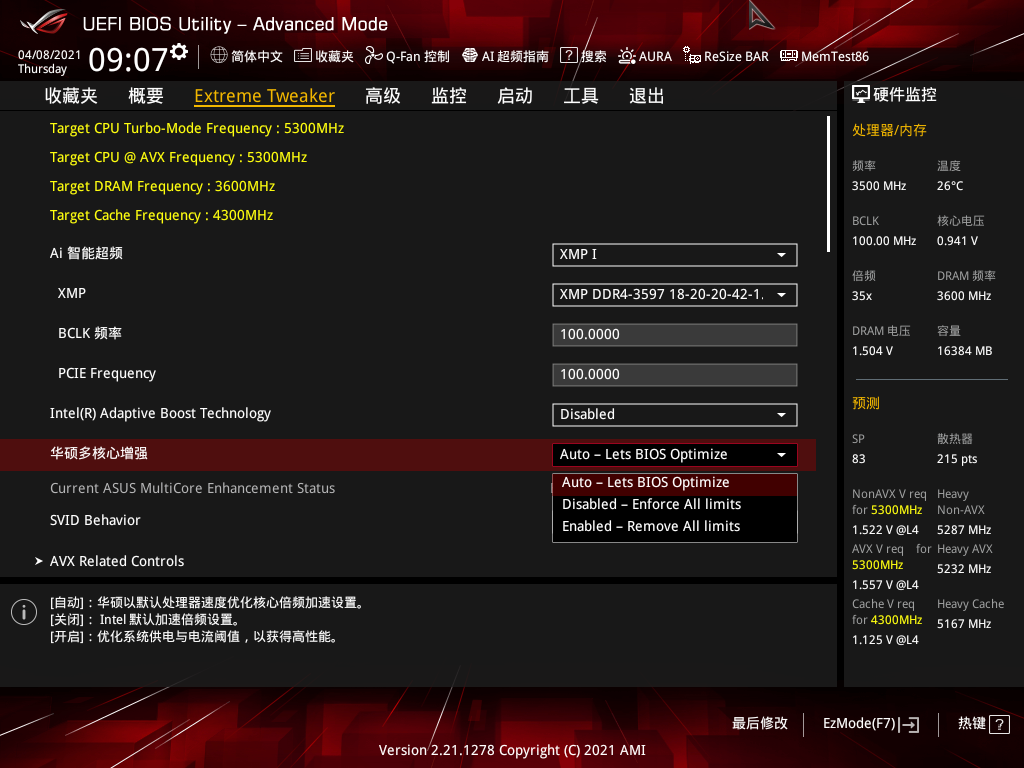 进入ROG Maximus XIII Hero主板的BIOS后,我们可以在左侧界面中看到主板对当前处理器和散热器的AI评分。我们这颗酷睿i9 11900K的评分为83分,体质表现一般,对于想要进行极限超频的玩家来说,选择一颗评分在90分甚至100分以上的处理器,会让超频变得更加顺利。同时也可以看到我们使用的这款散热器的评分为215分,在一体式360水冷中已经处于第一梯队了。