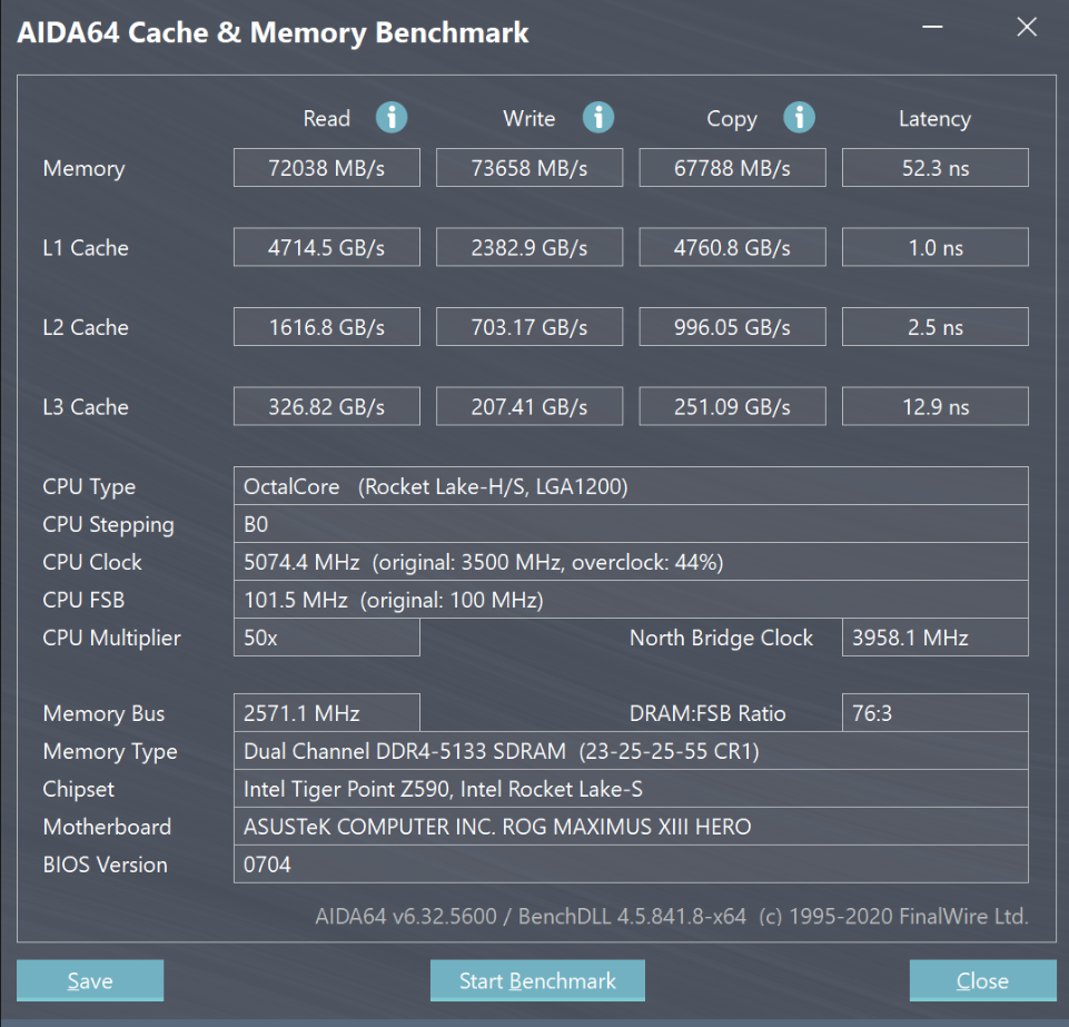 芝奇皇家戟DDR4 4600 8G×2使用了海力士颗粒,在XMP下的默认时序为18-25-25-45@1.5V。经过简单的调试,我们将其超频至了5143MHz@23-25-25-55,AIDA64的读写测试成绩为72000MB/s左右,延迟则为52.3ns。